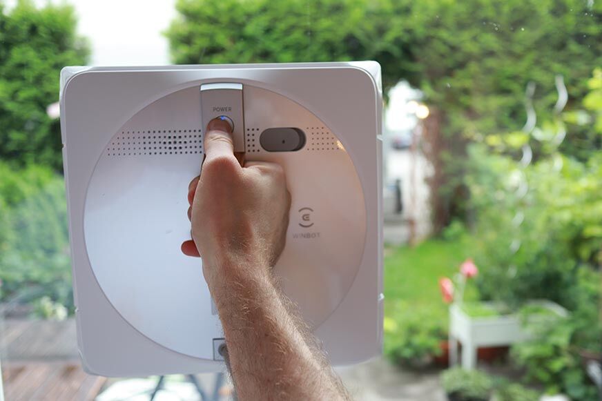 Nun bringst Du den Roboter an der Scheibe an. Hierzu musst Du ihn einfach ans Fenster halten und den Startknopf drücken.